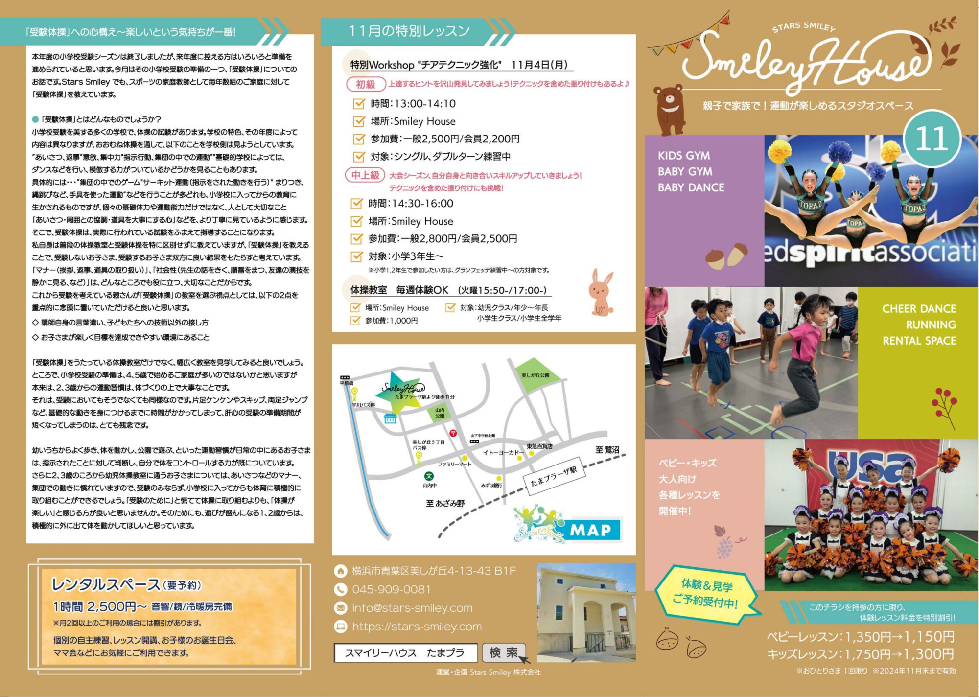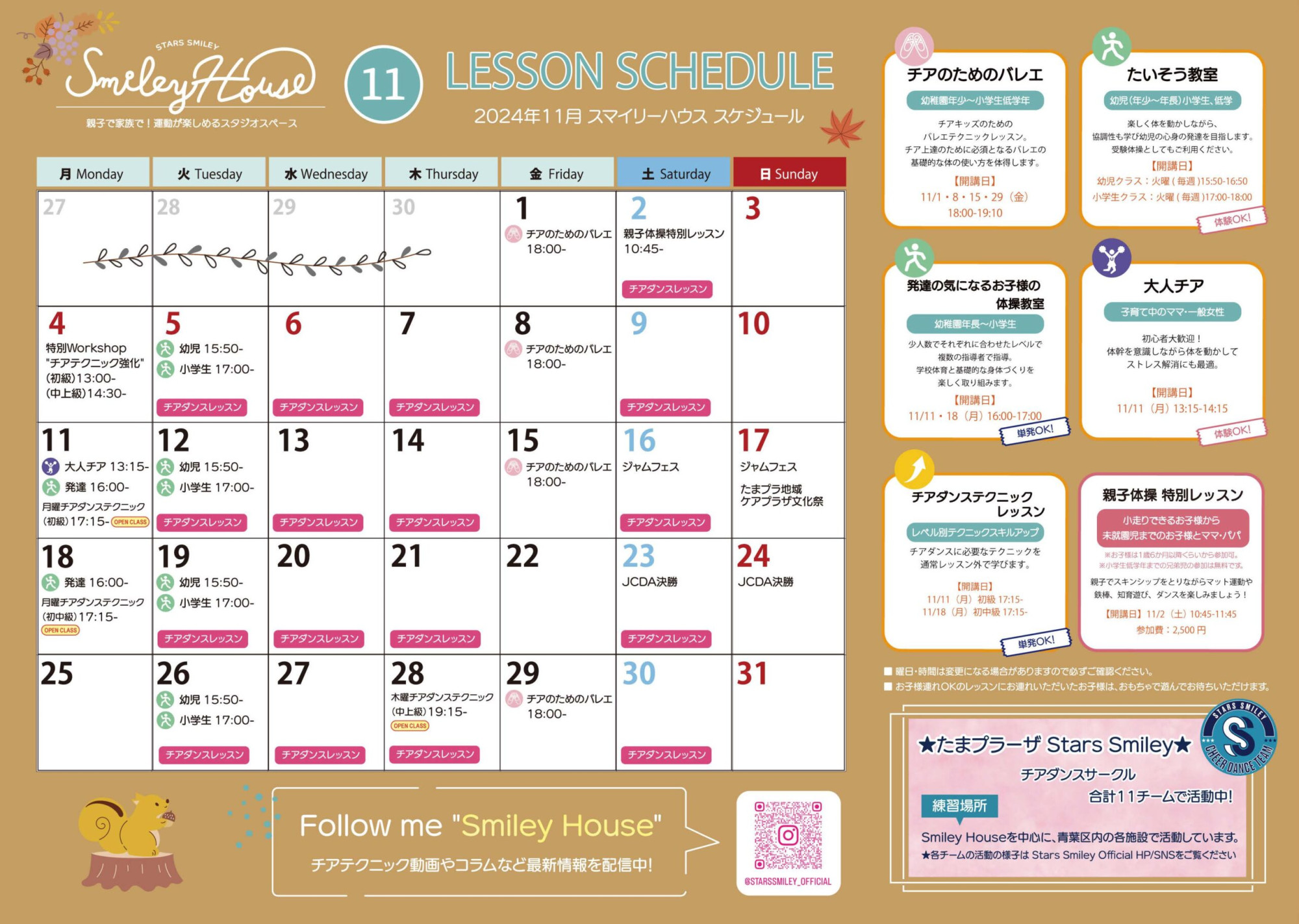 朝夕は寒さを感じる季節になってきましたね。 11月のSmileyは、体操教室体験イベントのお知らせやチアダンスレッスンのご案内です。皆様のご参加をお待ちしております。♪
