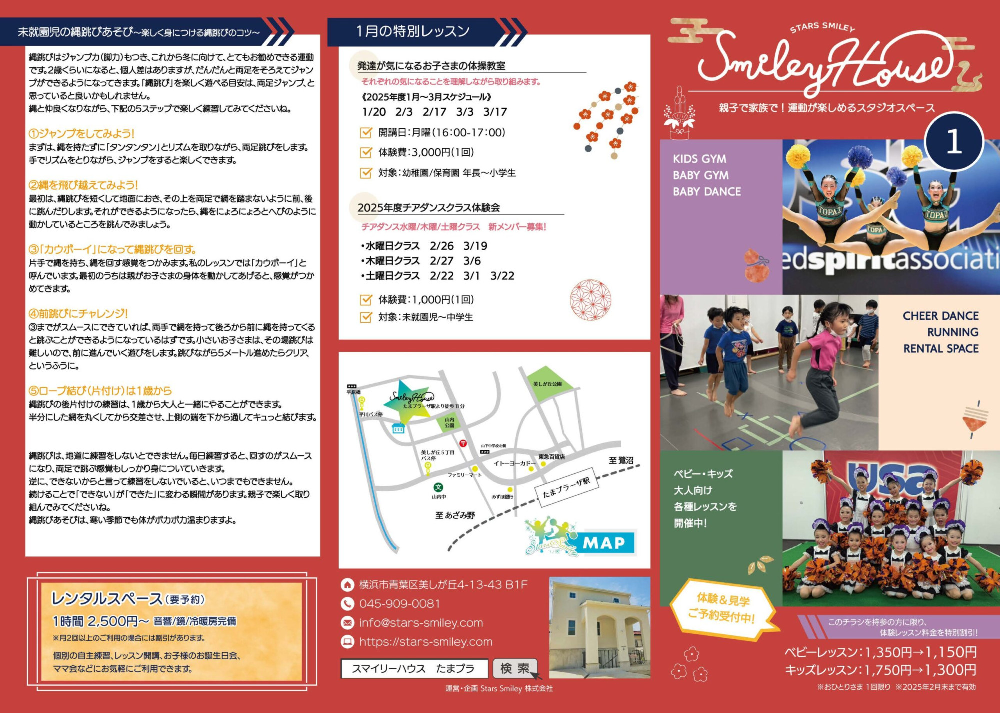 寒い日が続きますが、体調崩されていないでしょうか? 年末年始は12月28日から1月4日までは休業となります。 新年1月のSmileyは、体操教室やチアダンステクニックレッスン、発達の気になるお子さまの体操教室のご案内です。皆様のご参加をお待ちしております。♪